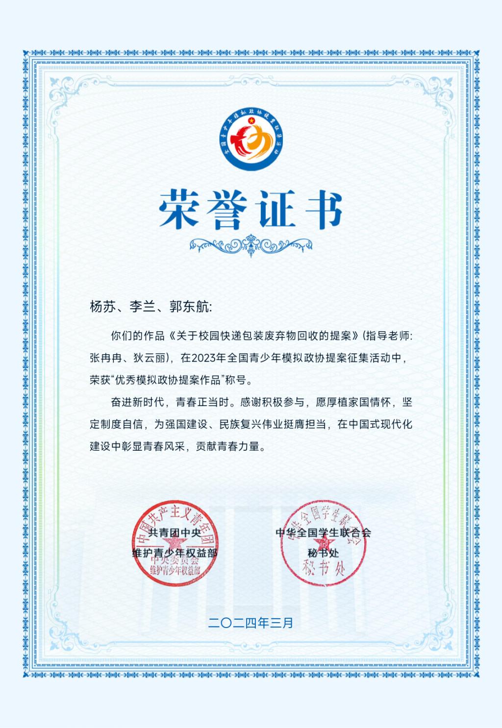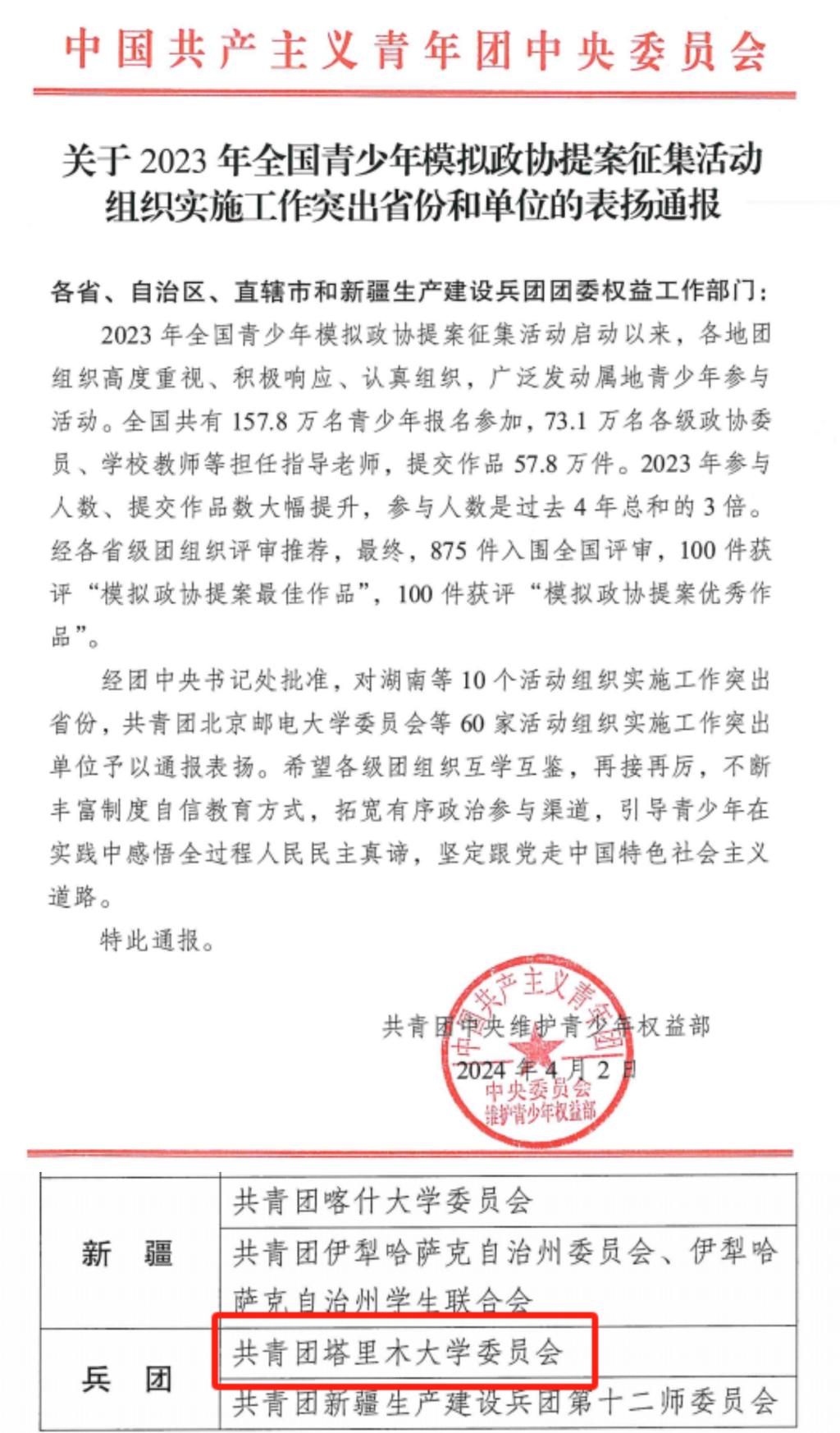 近日,团中央开展的2023年“全国青少年模拟政协提案征集活动”落幕。我校人文学院推荐的作品《关于校园快递包装废弃物回收的提案》获全国优秀模拟政协提案作品。经团中央书记处批准,对共青团塔里木大学委员会等60家予以通报表扬。