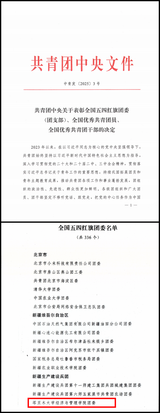 近日,共青团中央发布了《共青团中央关于表彰全国五四红旗团委(团支部)、全国优秀共青团员、全国优秀共青团干部的决定》,我校经济与管理学院团委荣获全国“五四红旗团委”称号。这是共青团中央授予基层团组织的最高荣誉,也是兵团高校中唯一获此表彰的单位。