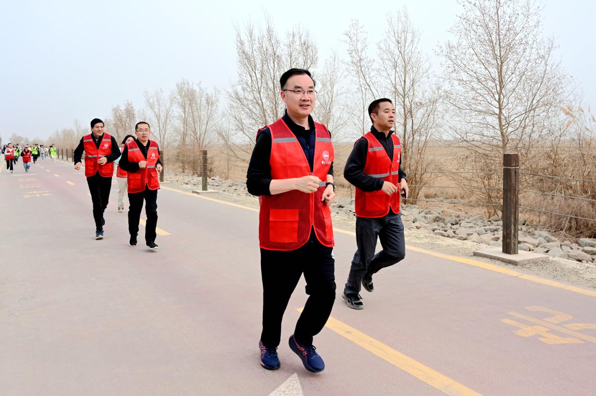 活动现场,随着鸣枪发令,校领导闫祥林、张宏荣,与师生们一起冲出起点,沿塔河步道跑向终点。